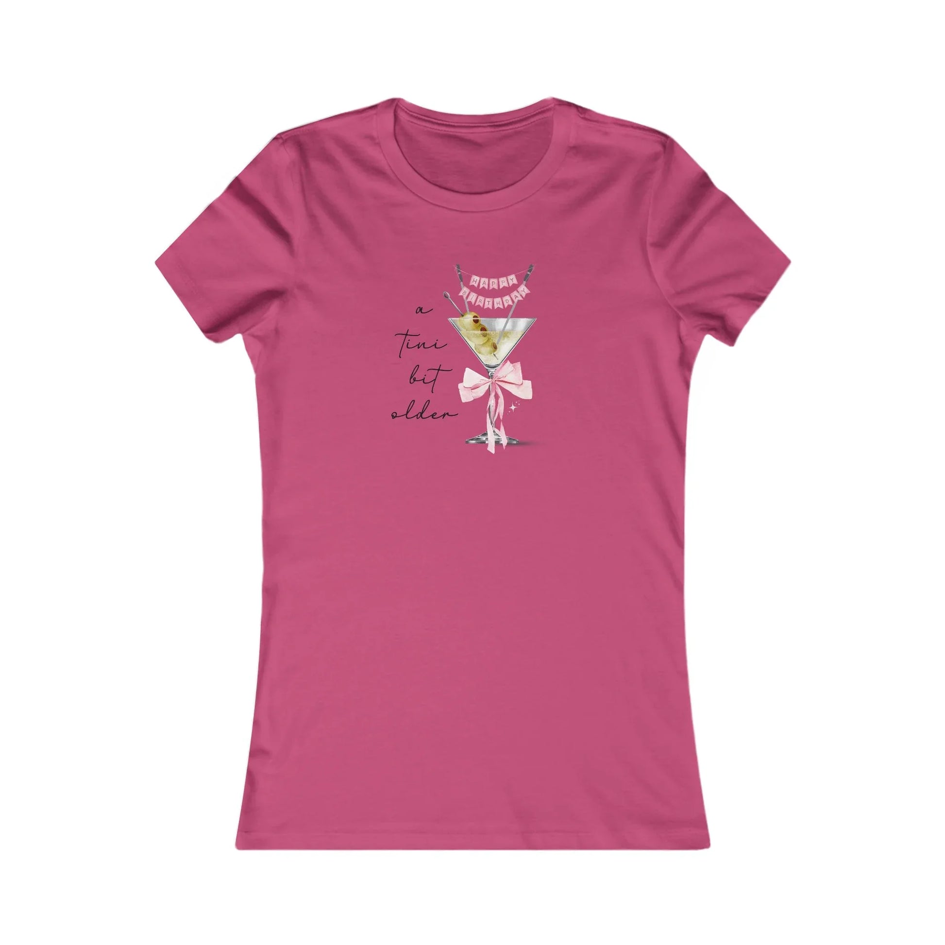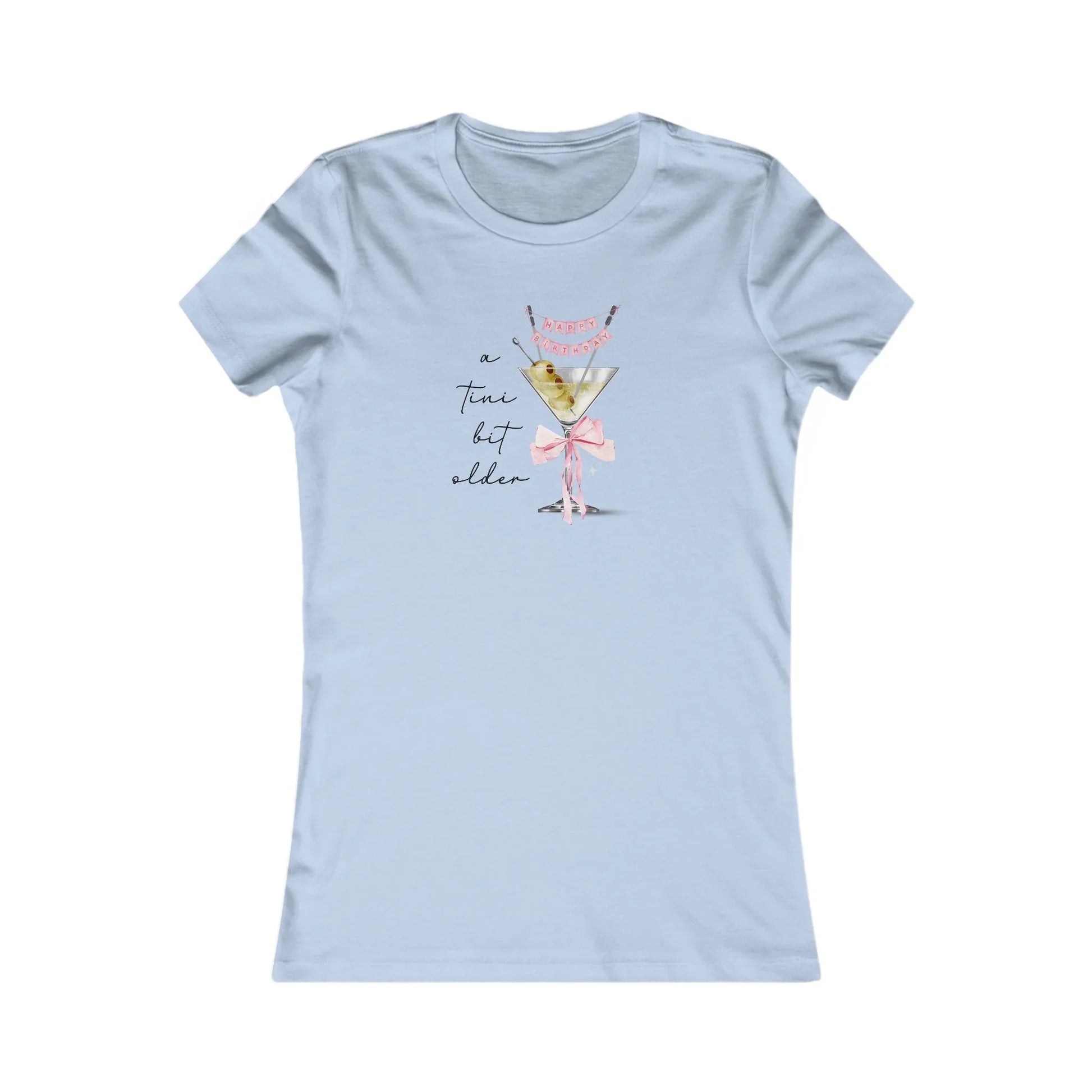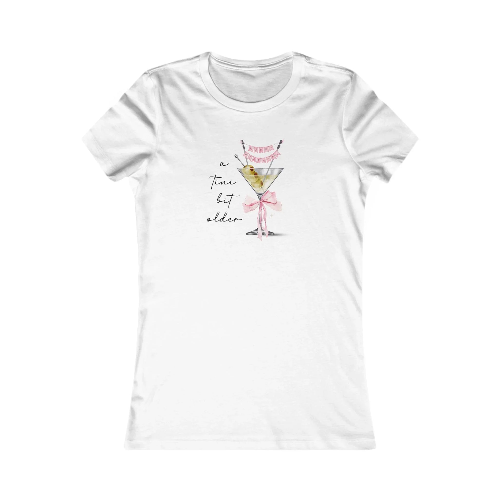 Embrace the joy of getting "a tini bit older" with wit and style in our delightful "A Tini Bit Older! Happy Birthday" Women's Favorite Tee! This charming t-shirt captures the essence of a birthday celebration with a clever and sophisticated graphic. At its heart stands a classic martini glass, perfectly filled with olives, and elegantly garnished with a festive miniature "HAPPY BIRTHDAY" banner strung across its top. A sweet pink bow adorns the stem of the glass, adding a touch of celebratory flair. Beside this chic cocktail, the playful script declares, "a tini bit older," inviting a knowing smile from anyone who appreciates a good pun and a fabulous celebration. This isn't just a tee; it's a toast to aging gracefully (and humorously!), making it the perfect attire for any birthday bash.