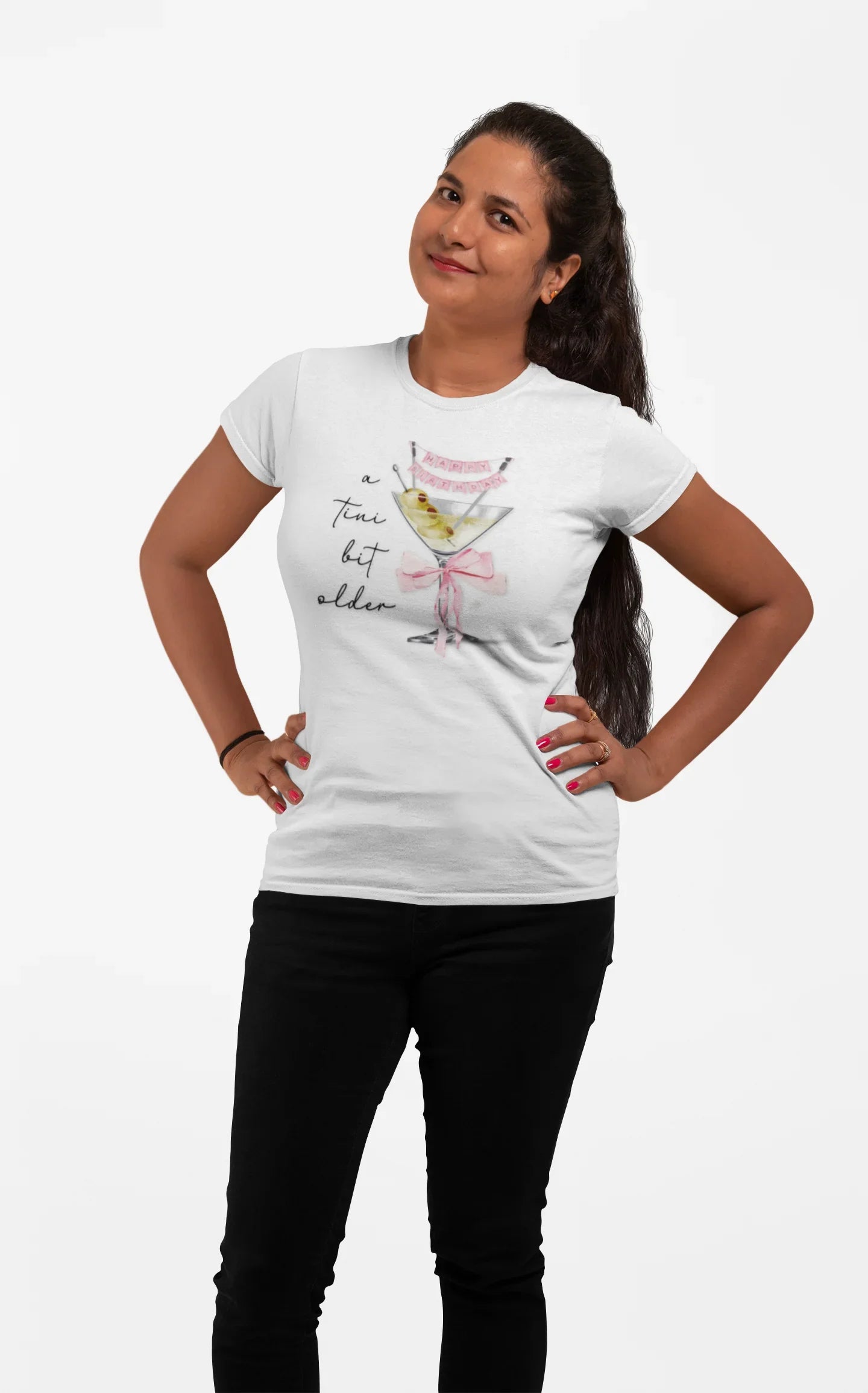 - Witty Birthday Design: Features a martini glass with "HAPPY BIRTHDAY" banner and "a tini bit older" text. 🍸💖