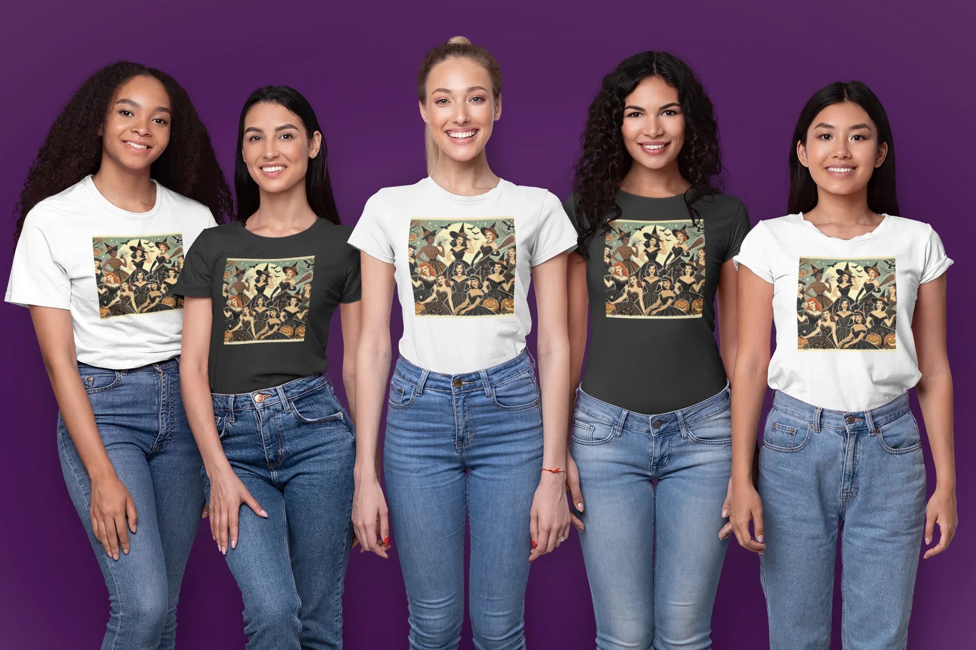 The "Charmed & Chic: Retro Witches Coven" design is both stylish and enchanting, with its vintage aesthetic, captivating imagery, and a touch of Halloween magic. It's a great way to express your love for Halloween while embracing your inner fashionista.