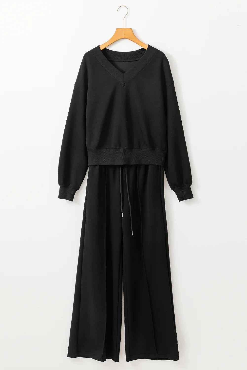 - Design: Two-piece set including a V-neck cropped top and high-waist long leggings.