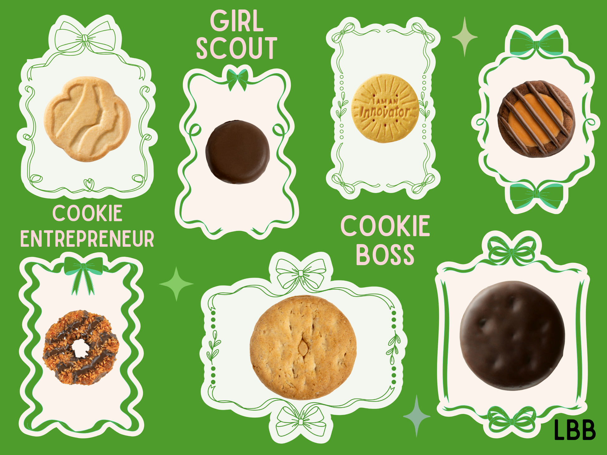 This LBB version includes cookie art inspired by well-loved favorites that many councils sell through Little Brownie Bakers. Depending on your area, you may recognize classics like Thin Mints, Samoas, Tagalongs, Trefoils, and Do-si-dos. Even if customers call cookies by different names in other regions, the cookie card style is instantly recognizable and always booth-appropriate. It’s a fun conversation starter too, especially when customers notice the cookies and ask which ones are included.
