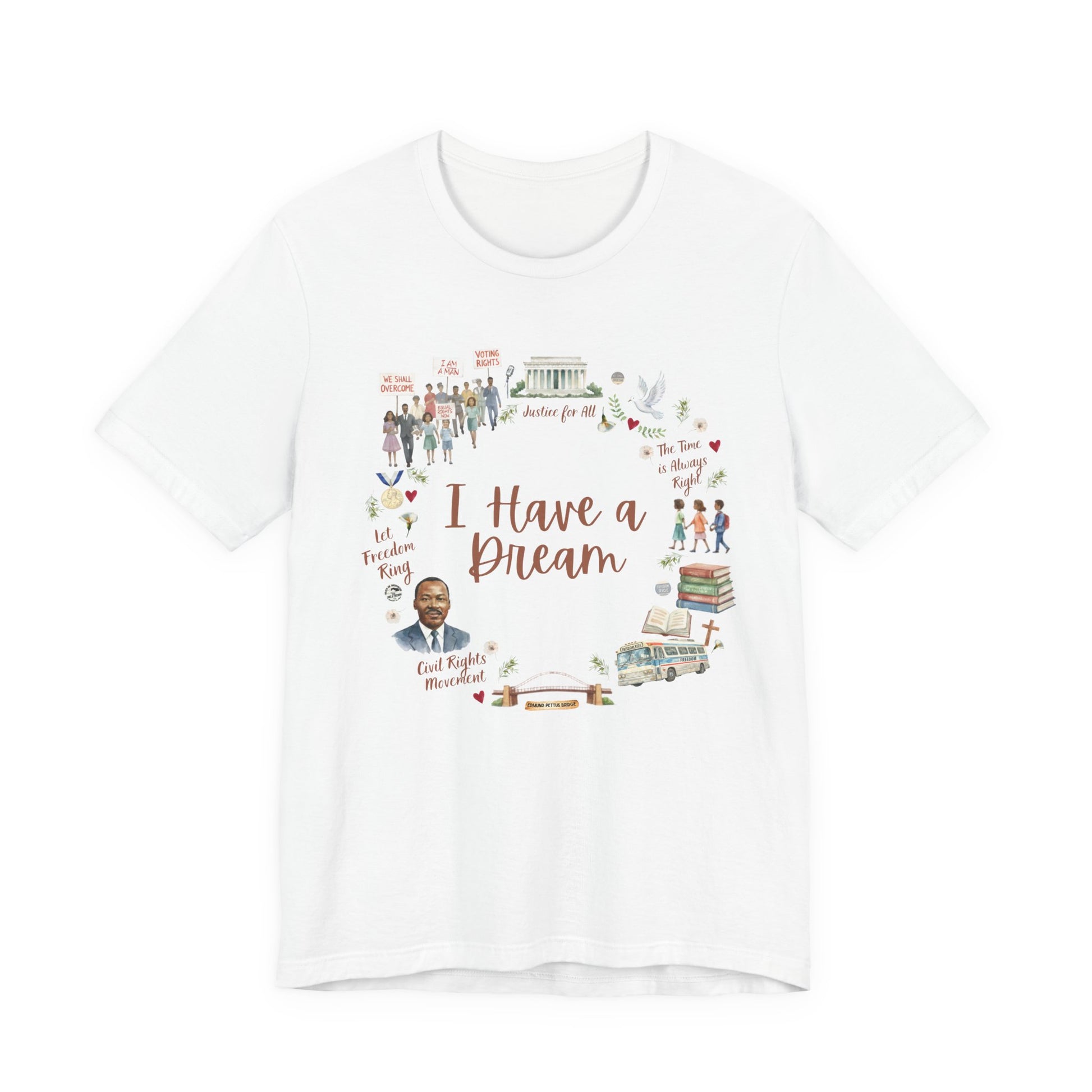 Honor hope, unity, and progress with our meaningful mlk tee. This inspiring design celebrates Dr. Martin Luther King Jr. and the dream of equality. A warm watercolor wreath surrounds the hand-lettered phrase, “I Have a Dream.” Each icon adds a thoughtful detail. You will notice peaceful marchers, books, historic landmarks, and a portrait. Together, they tell a story of courage and change.