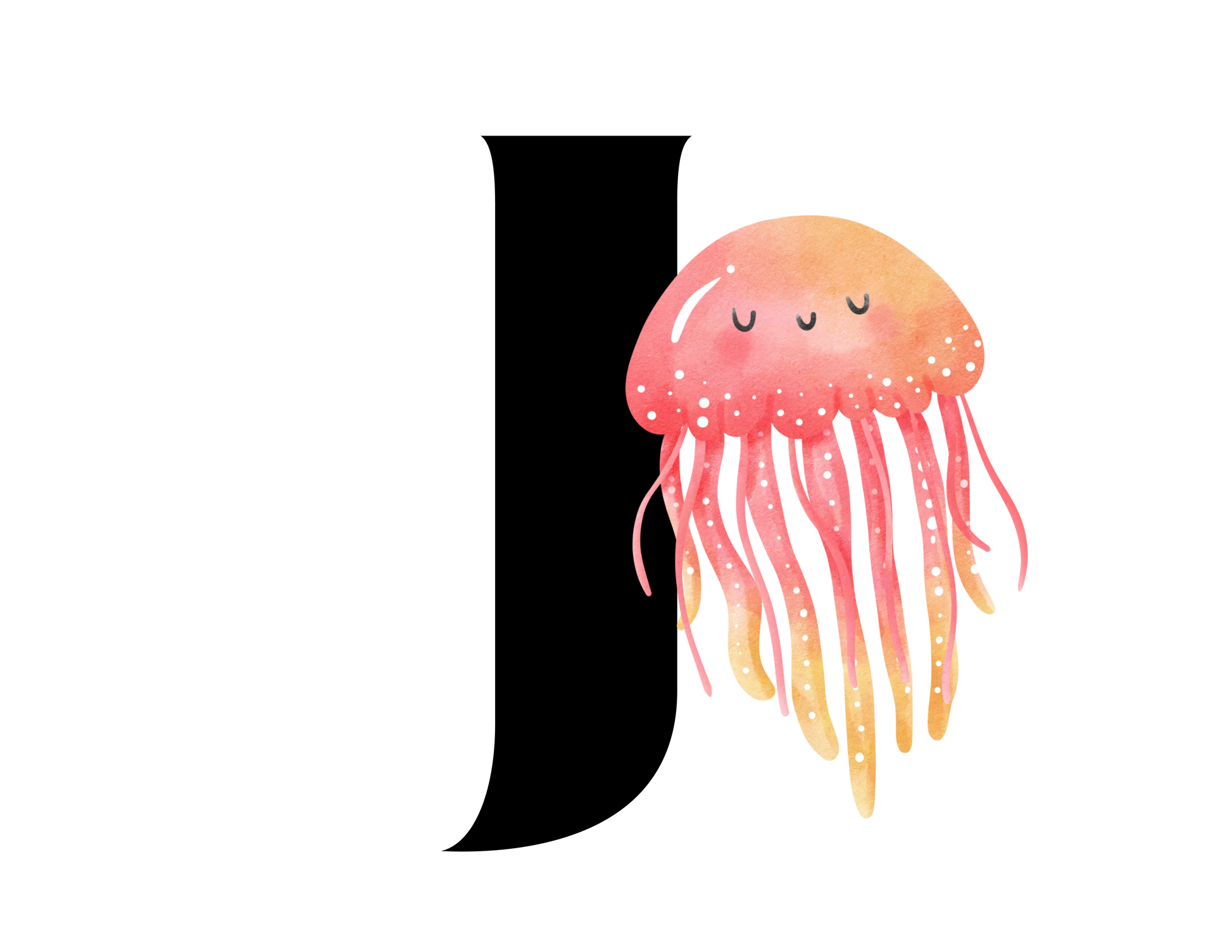 Alphabet Adventure Design: Features a charming jellyfish letter J illustration. 🐙