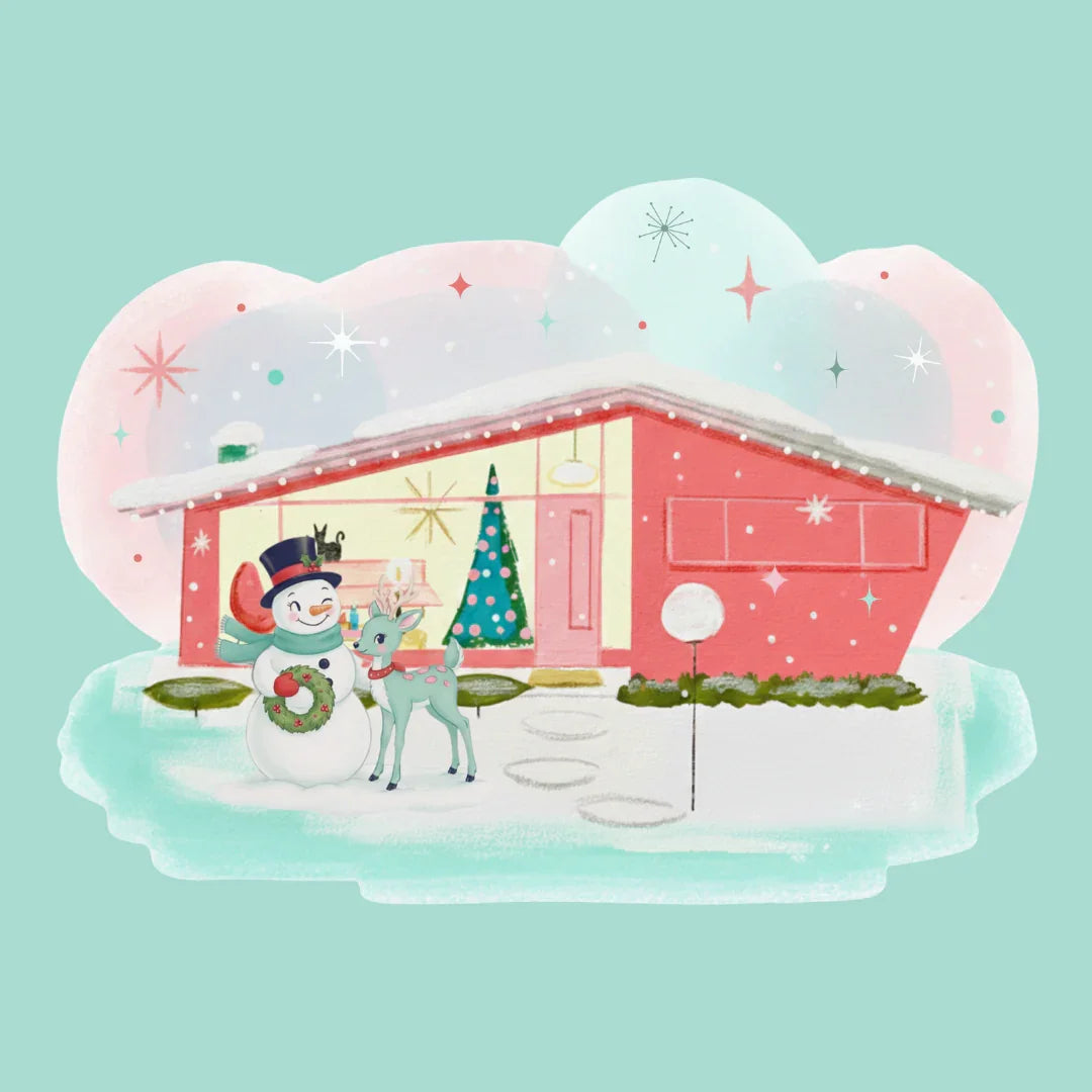 The vibrant colors—including teals, pinks, and reds—make this pillow a true focal point. The iconic ranch-style house silhouette is instantly recognizable as Mid Century Christmas decor, perfectly capturing the aesthetic of the 1950s and 60s. The playful snowman and deer illustration adds a whimsical charm that feels both classic and cool. When you are looking for an easy way to update your space for the holidays, this single Mid Century Christmas accessory provides maximum impact. It is a fantastic gift for any retro enthusiast or lover of unique holiday art. Bring the joy and bold style of a Mid Century Christmas into your home with this beautiful, soft cover.