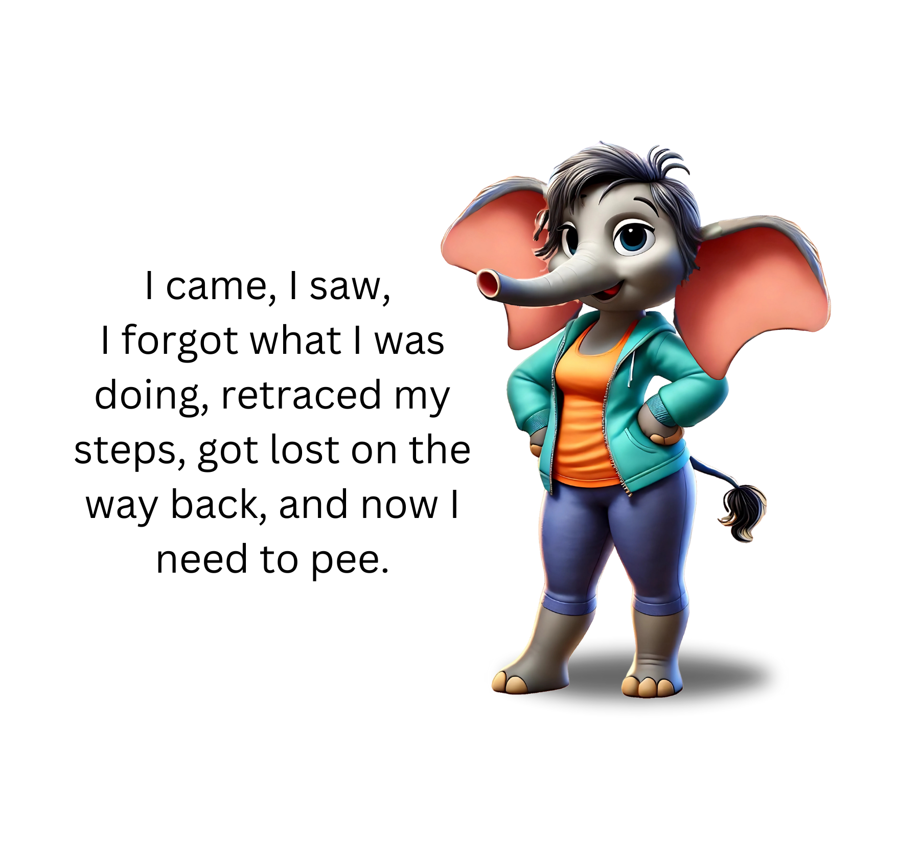 This "I Came, I Saw..." Mom Brain - Women's Tee perfectly captures the hilarious reality of those "mom brain" moments we all know and love. 🐘🤪 Featuring a relatable and funny quote, "I came, I saw, I forgot what I was doing, retraced my steps, got lost on the way back, and now I need to pee," accompanied by an adorable illustration of an elephant mom in jeans, a tank top, and a jacket, this t-shirt is a must-have for any mom who appreciates a good laugh and a touch of self-deprecation.