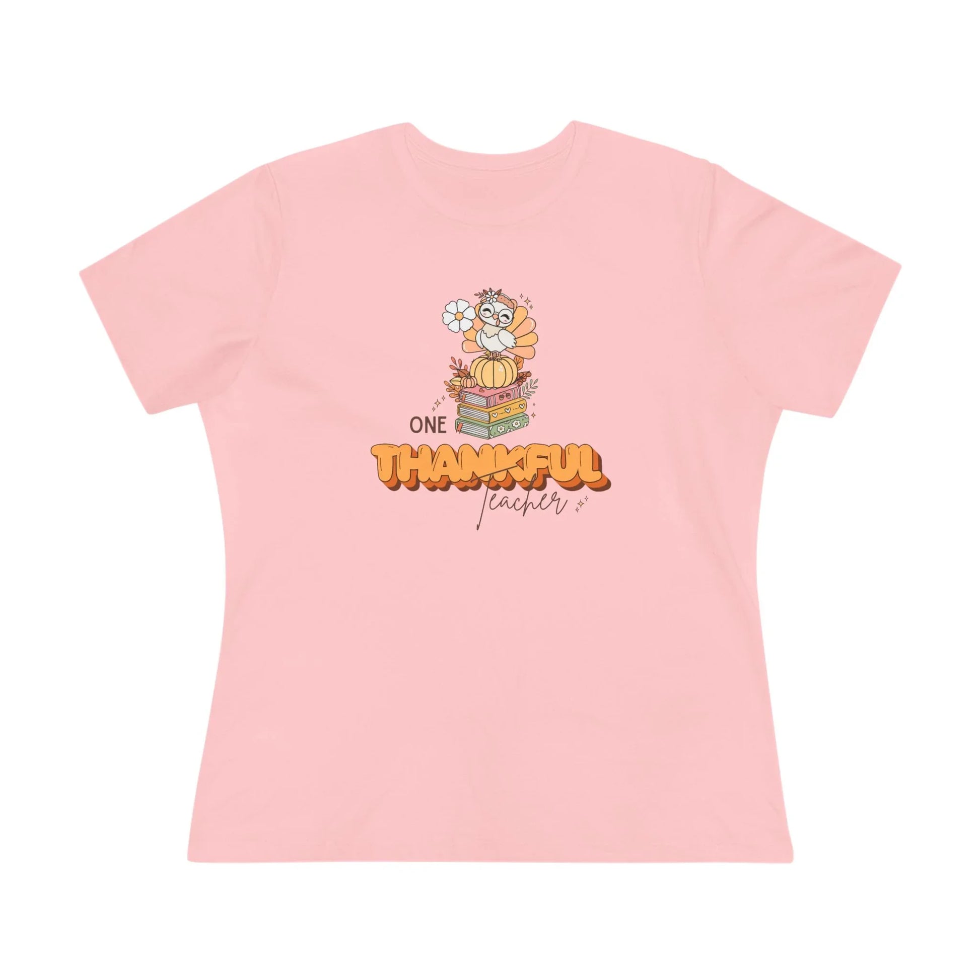 The unique graphic features the words "One Thankful Teacher" alongside an adorable autumnal turkey/owl character perched atop a stack of schoolbooks, surrounded by fall leaves and miniature pumpkins. It’s a whimsical and heartfelt tribute to educators who nurture young minds. The design's cheerful colors and artistic details will instantly brighten up the classroom during the holiday season. The relaxed fit means it’s comfortable enough for grading papers or leading a class activity. Thank a teacher: This charming garment is more than just a shirt; it’s a wearable expression of gratitude for the work of a truly thankful teacher.