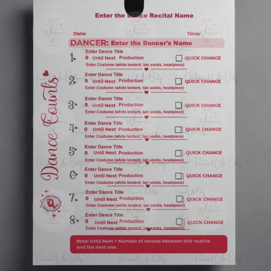The Recital Dance Counts Tracker Printable is your backstage command center for recital day. Designed for dancers with multiple routines in one show, this tracker helps you see how many dances are between each routine, what style is coming up, and exactly what costume pieces are needed next. Instead of flipping through programs or guessing how much time you have, this sheet gives helpers, parents, and dancers a clear plan they can follow in real time.