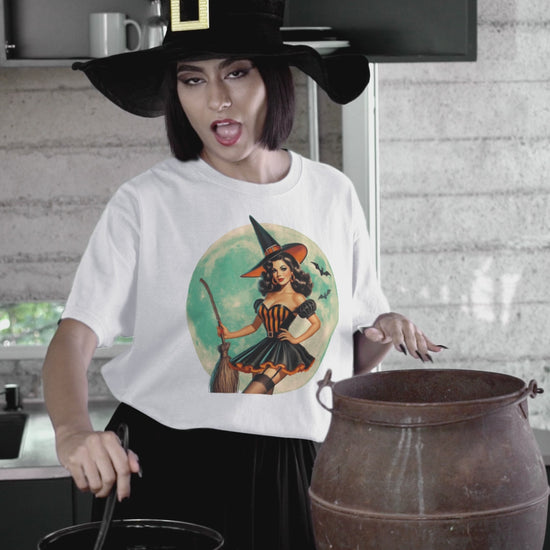 This "Bewitching Retro Tee" is a captivating blend of vintage glamour and Halloween magic. It is perfect for anyone who loves Halloween. It is also for fans of vintage fashion. There is a touch of spooky sophistication. The stunning illustration is of a captivating retro witch. She has an enchanting aura. She is dressed in a retro 50s pinup dress. She is soaring through the night sky. She flies on a broomstick.