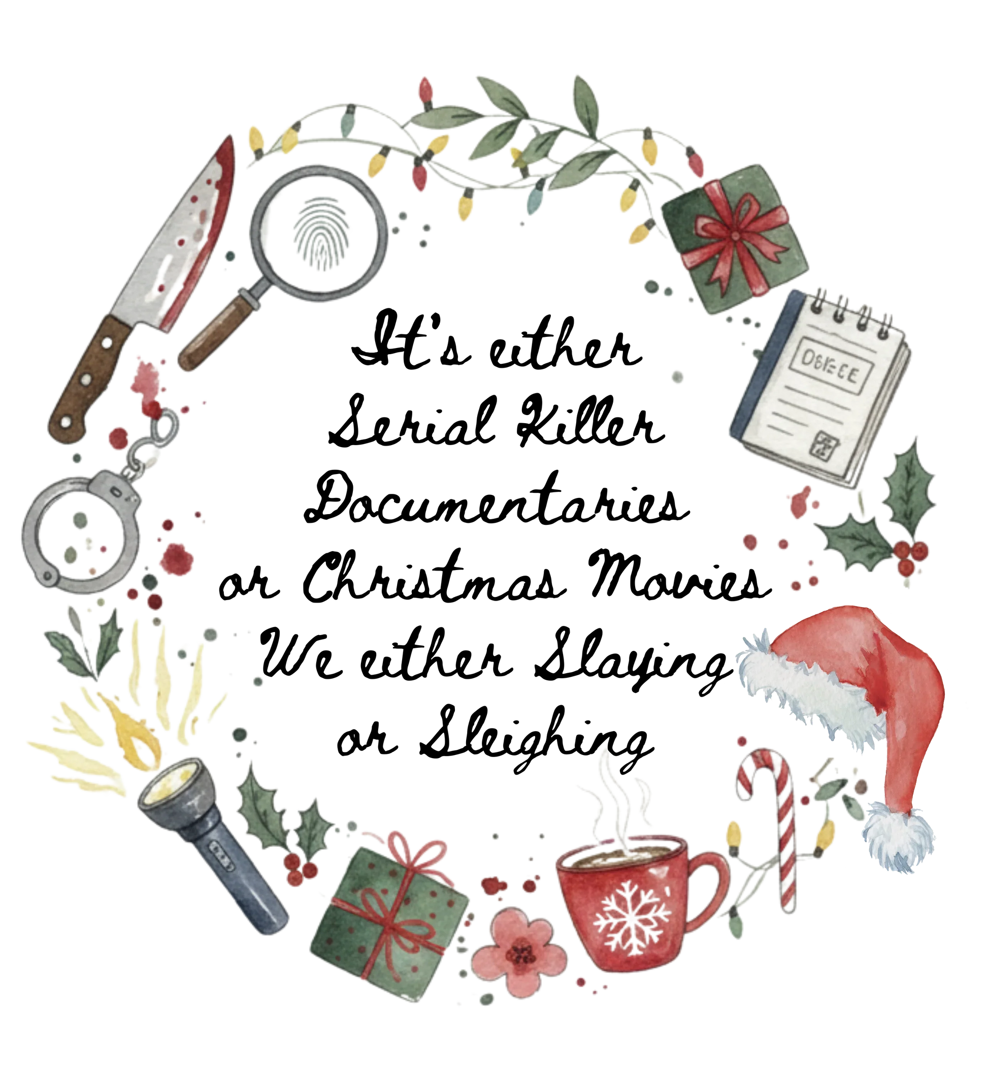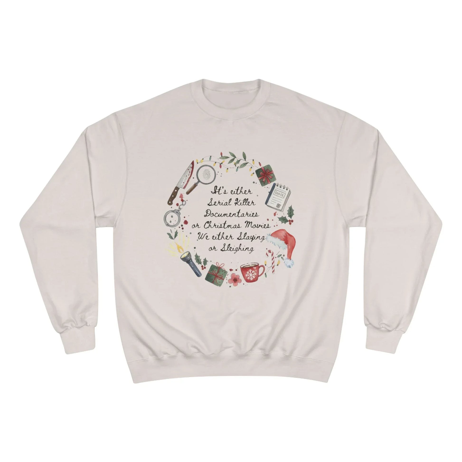 This premium Champion crewneck features the hilarious "It's either Serial Killer Documentaries or Christmas Movies. We either Slaying or Sleiging" graphic. The design cleverly blends a festive wreath with true crime elements like handcuffs, knives, and magnifying glasses. It’s a fun, quirky statement piece that is a standout addition to both our Christmas Collection and our Fun & Quirky Collection.