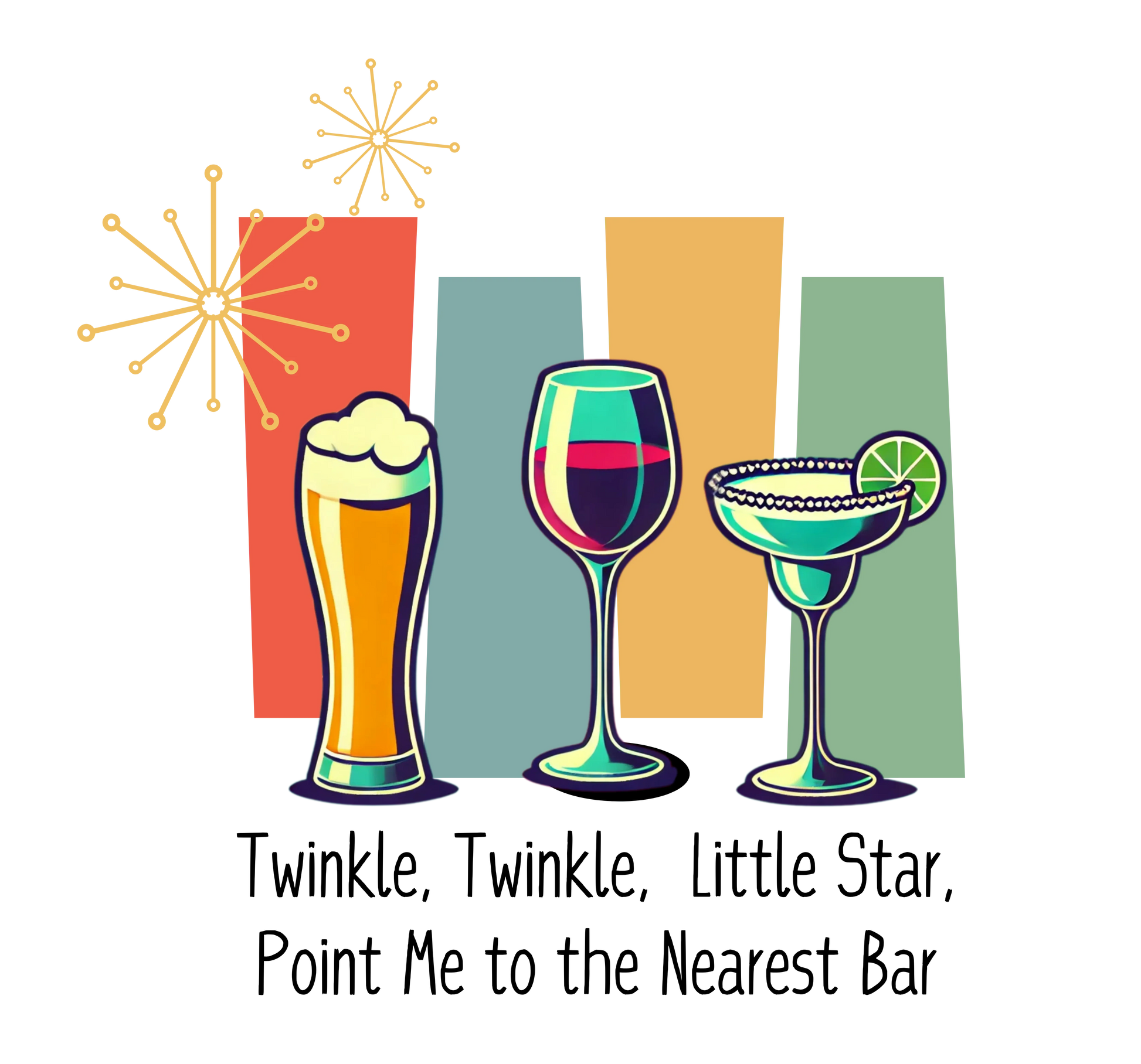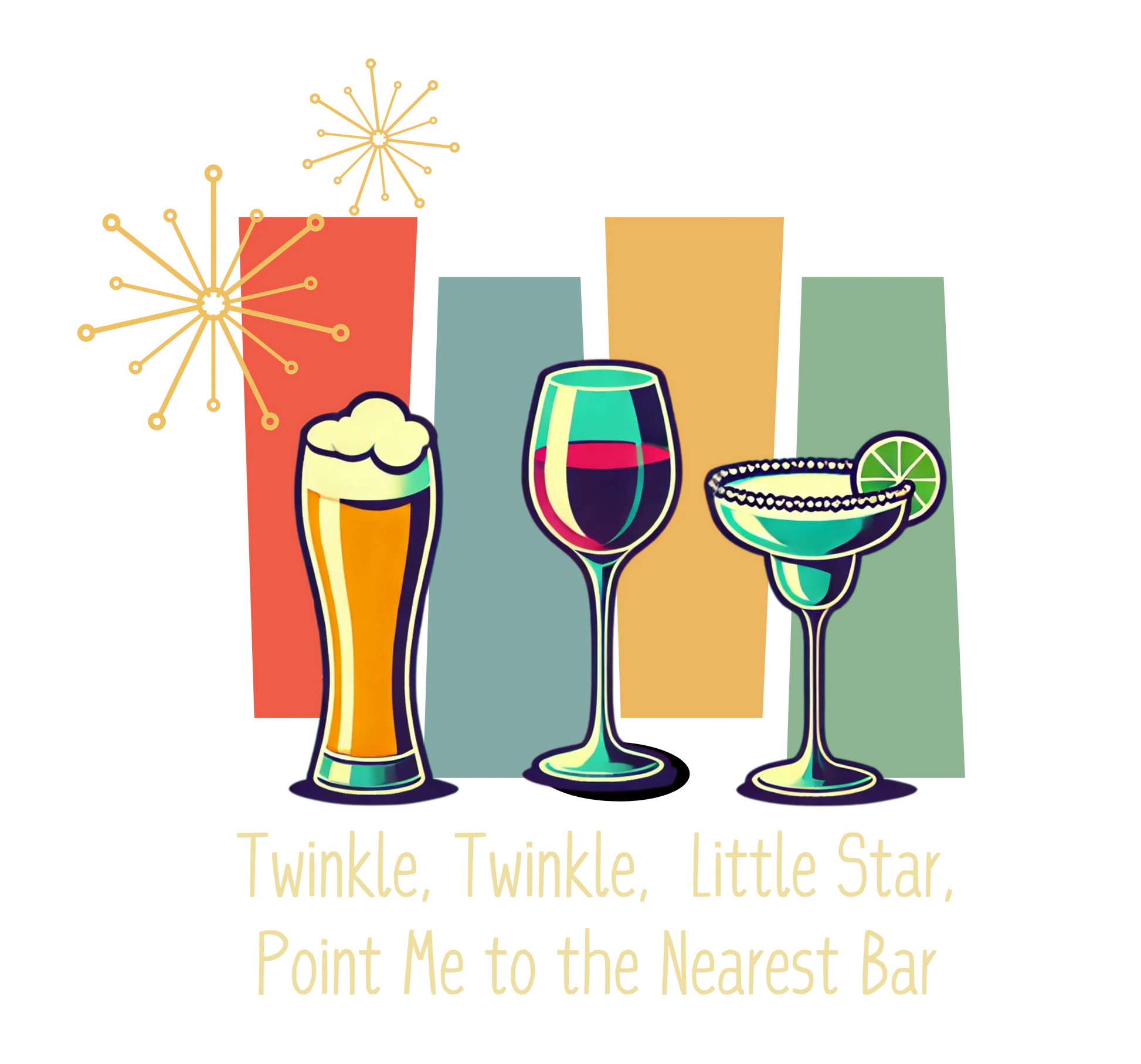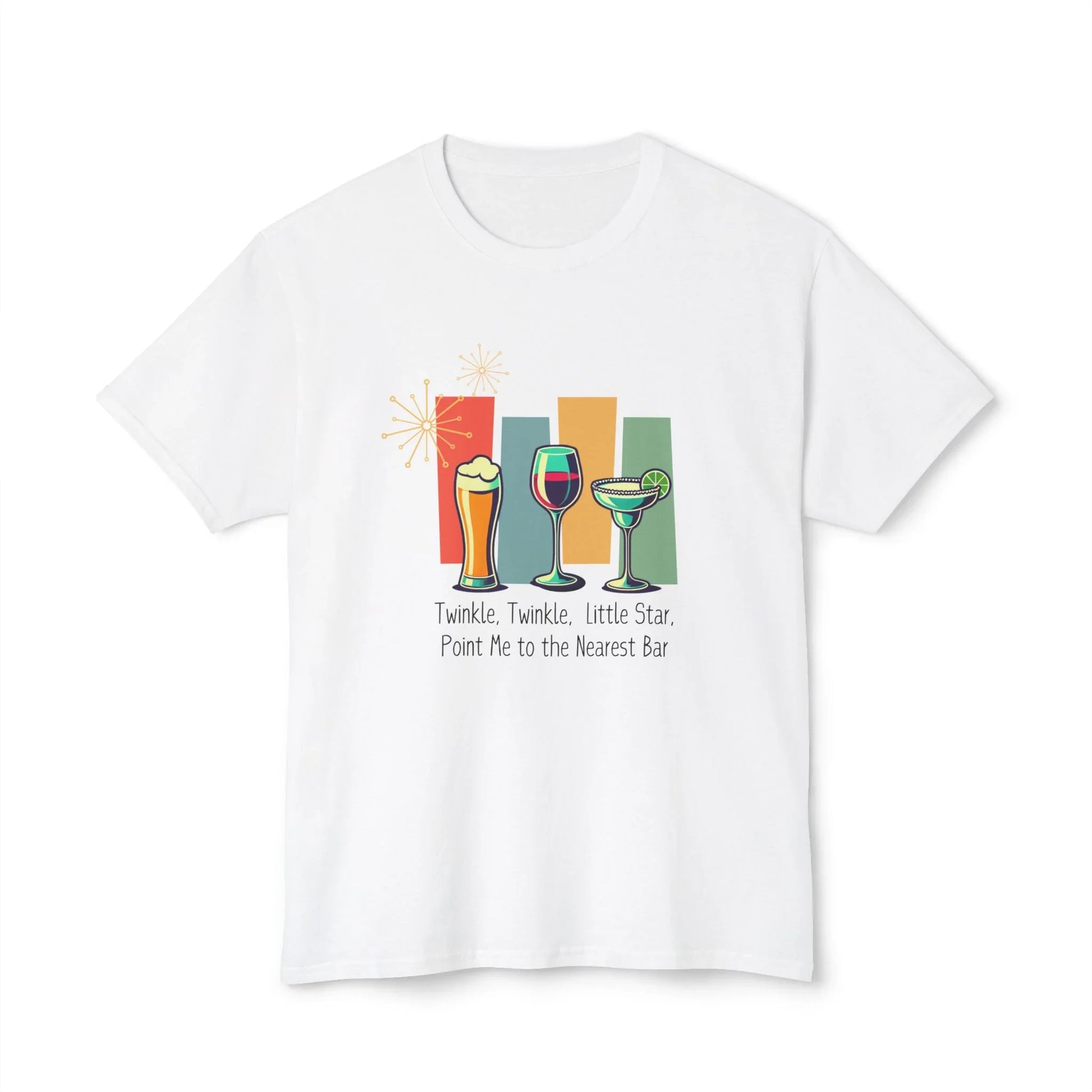 This Twinkle, Twinkle, Little Star, Point Me to the Nearest Bar Unisex Tee is a fun and playful way to celebrate the art of mixology and the joy of socializing. šø Featuring a whimsical design of a glass of beer, a glass of wine, and a margarita set against a retro 1950s backdrop, this t-shirt is sure to bring a smile to your face and spark conversations.